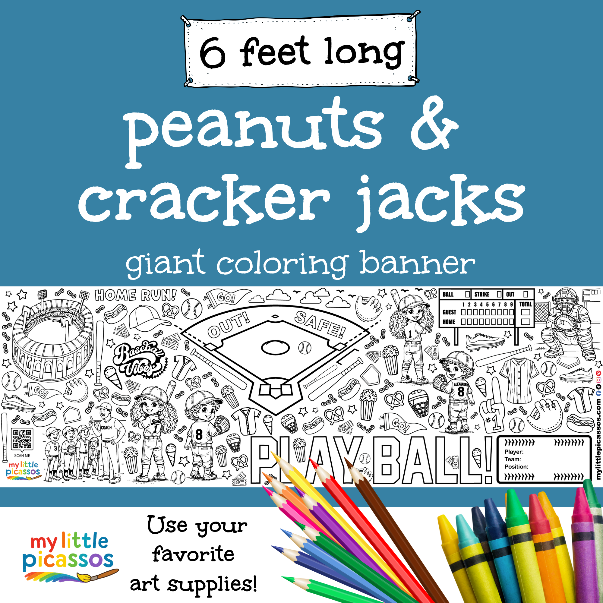 Celebrate sports and creativity with our Peanuts & Cracker Jacks coloring banner, a fun oversized activity for kids who love baseball and hands-on play. This giant banner is filled with baseball-themed illustrations that make it a great choice for birthdays, team parties, family gatherings, and screen-free fun at home.