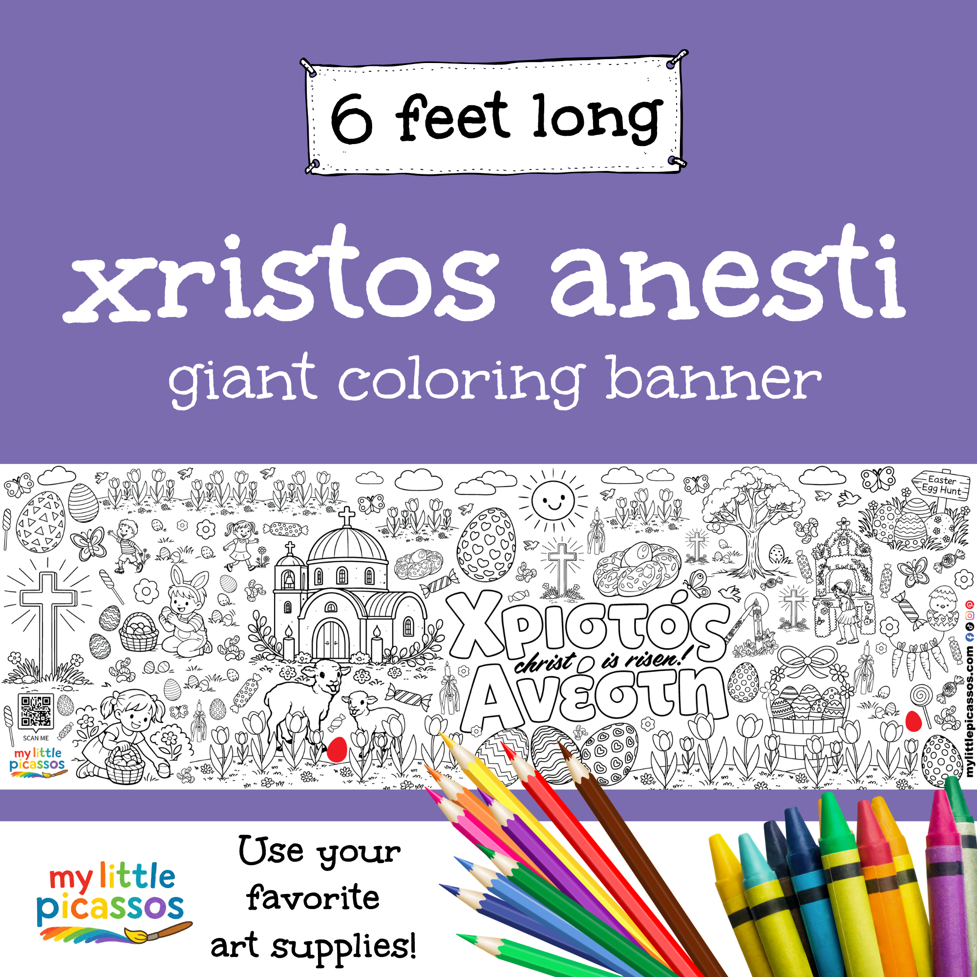 This Xristos Anesti Giant Coloring Banner gives children a fun and creative way to celebrate Greek Easter. The playful design encourages imaginative coloring, family time, and screen-free fun during holiday gatherings and spring celebrations.